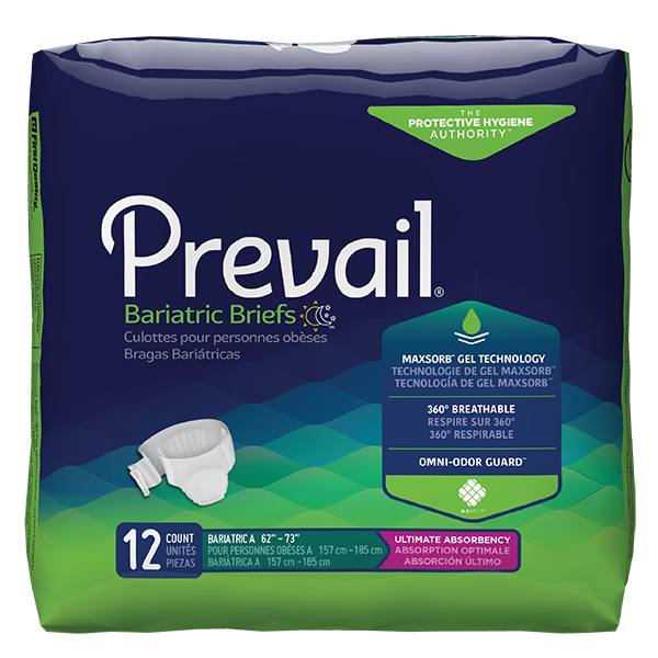 | Prevail Bariatric Briefs | Size A (62"-73") (12 count) | 090891500253 | Size A (62"-73") (48 count) | 791090875301 |